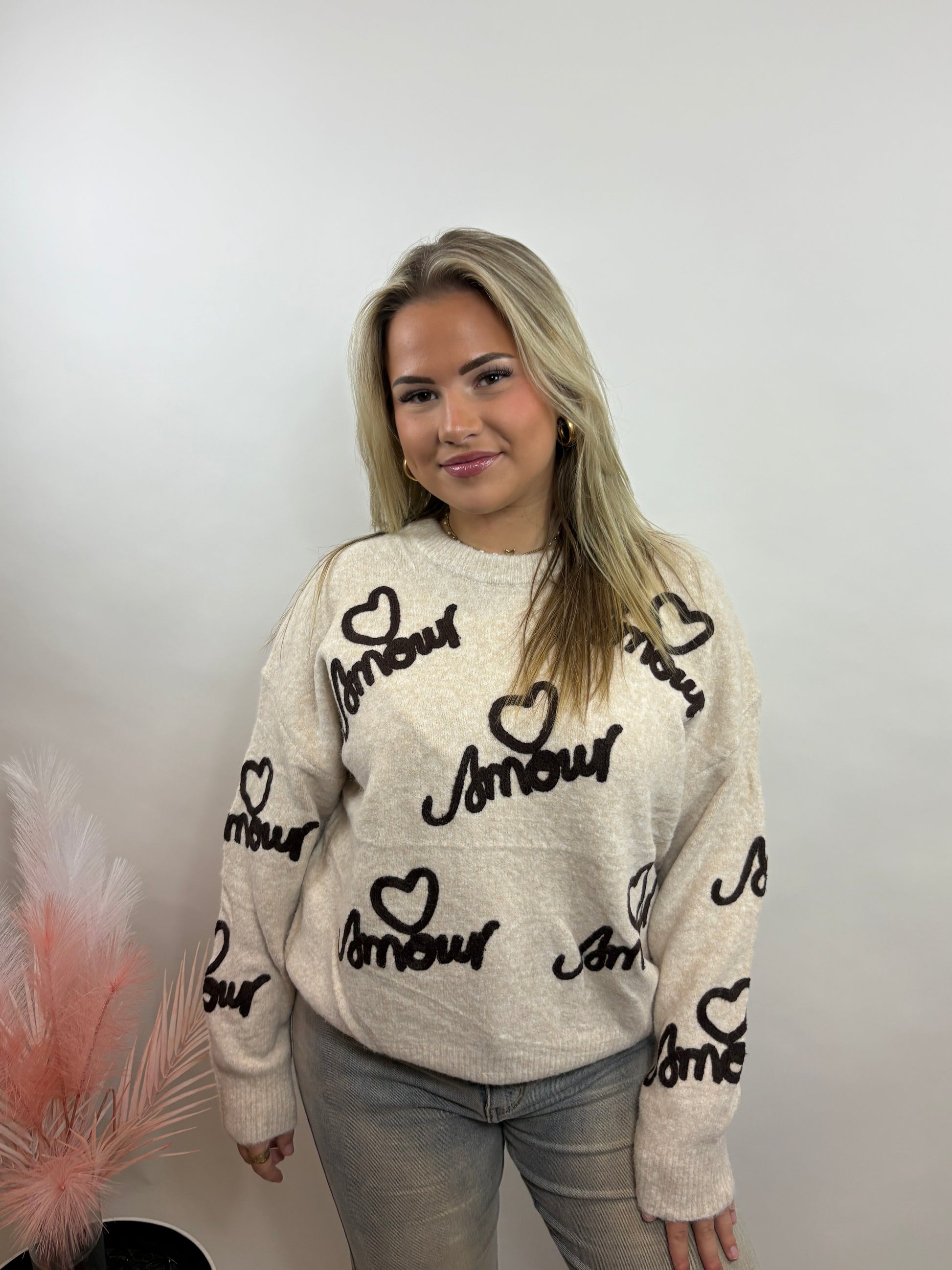 Deze zachte “Amour” trui is een echte musthave voor jouw garderobe! De hartjesdetails geven het design een speelse en romantische uitstraling. Dankzij de comfy pasvorm is dit de perfecte trui voor elke dag — warm, zacht én super stylish 💕