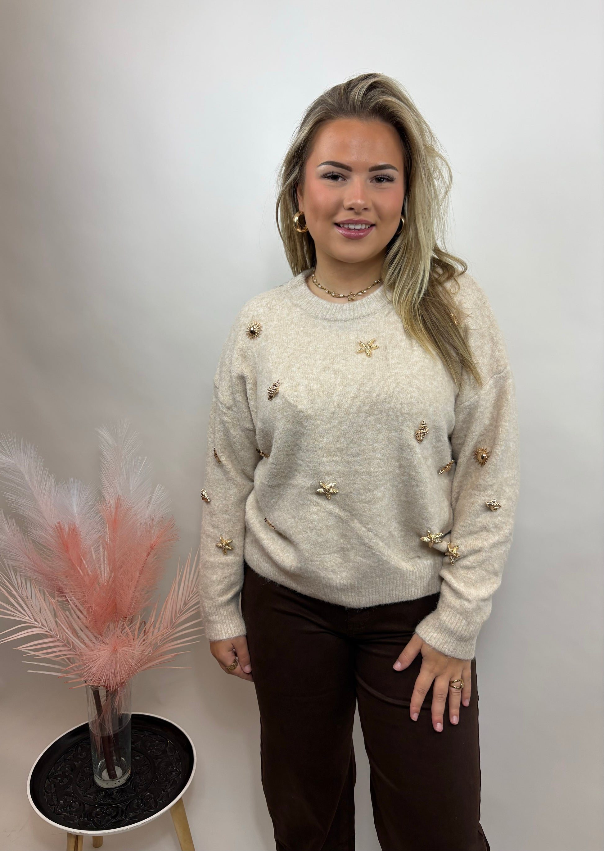 Upgrade jouw knitwear met deze stijlvolle trui vol gouden details! De zachte stof voelt super comfortabel aan en de sierlijke applicaties geven een chique glans aan je outfit. Perfect voor een casual dag en ook prachtig te stylen voor een avondje uit. Met dit item ben je altijd fashion-ready ✨