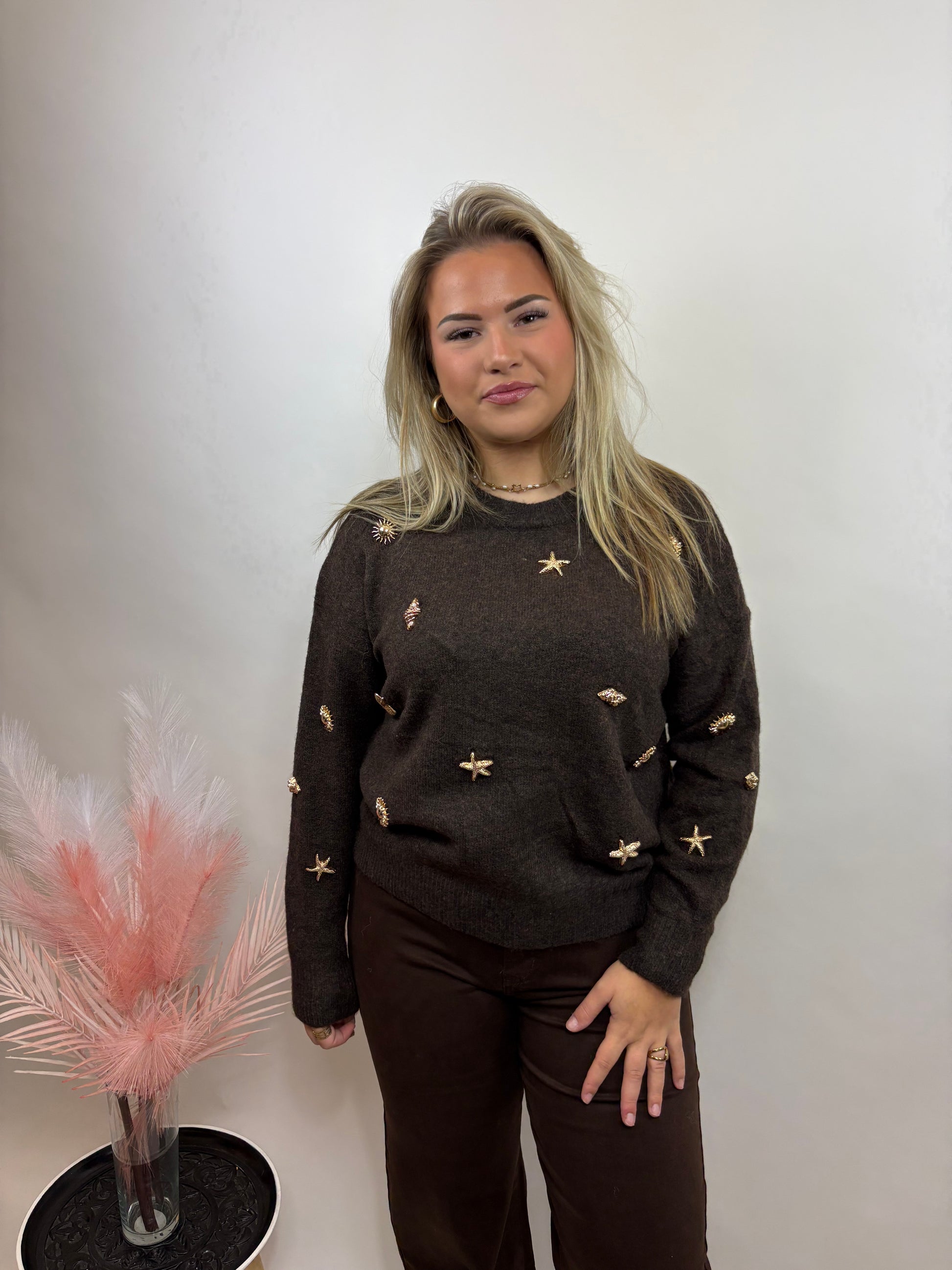 Upgrade jouw knitwear met deze stijlvolle trui vol gouden details! De zachte stof voelt super comfortabel aan en de sierlijke applicaties geven een chique glans aan je outfit. Perfect voor een casual dag en ook prachtig te stylen voor een avondje uit. Met dit item ben je altijd fashion-ready ✨