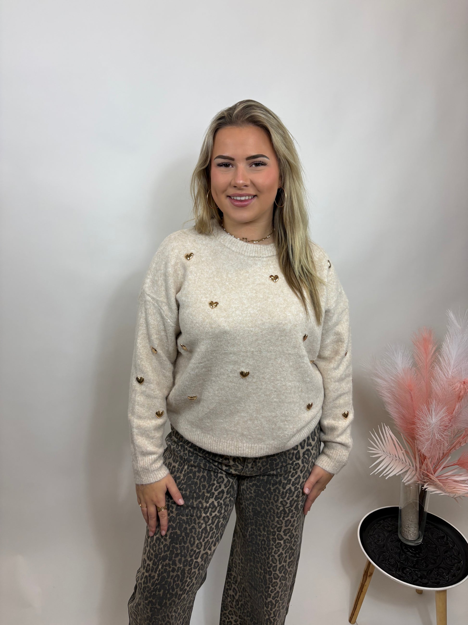 De Gouden Hartjes Trui is het perfecte item voor wie houdt van een zachte, vrouwelijke look met een vleugje glamour. De subtiele gouden hartjes over de hele trui geven een speels én chique effect. Dankzij de heerlijk zachte stof en comfortabele pasvorm is deze sweater ideaal voor zowel een relaxte dag thuis als een dagje uit.