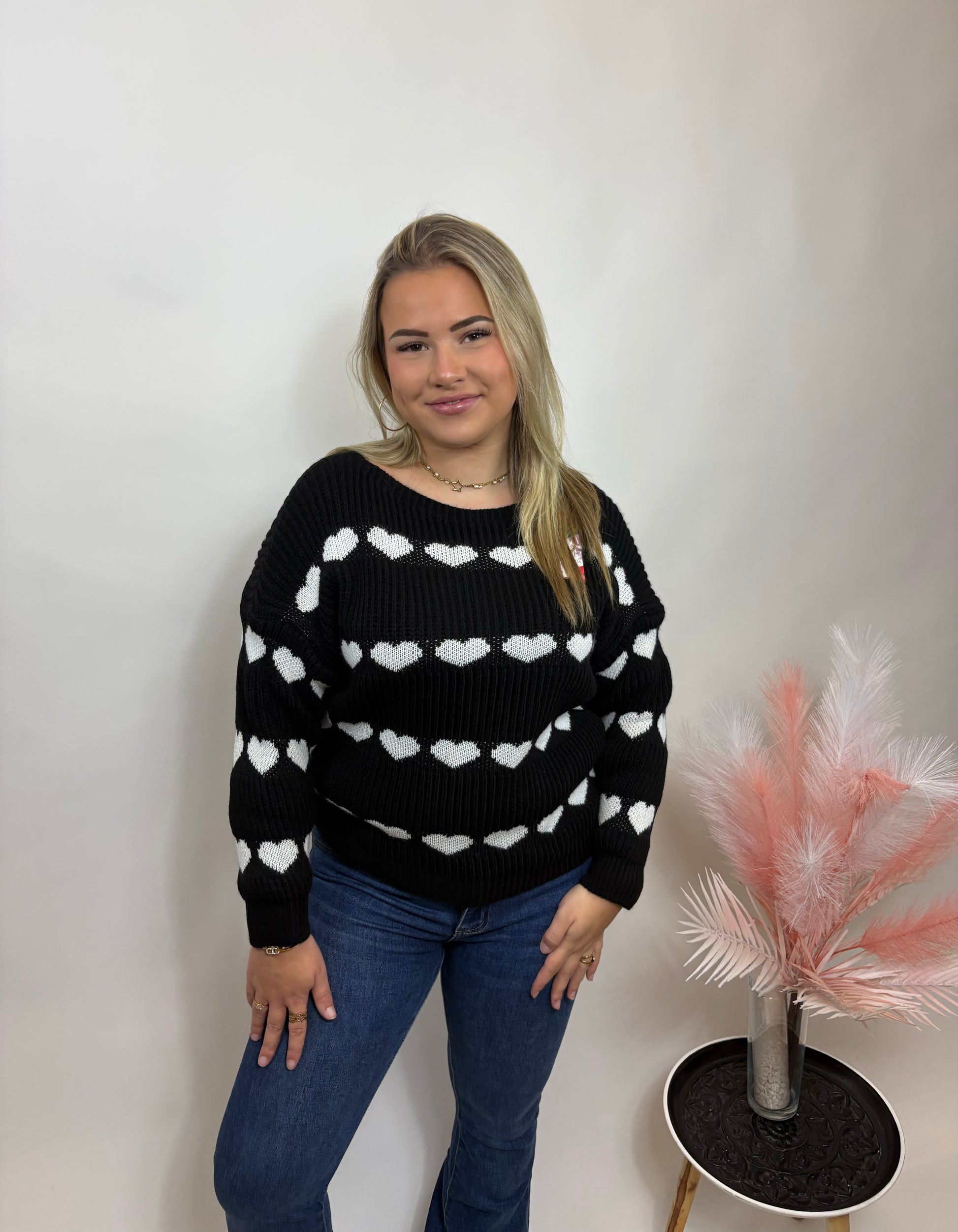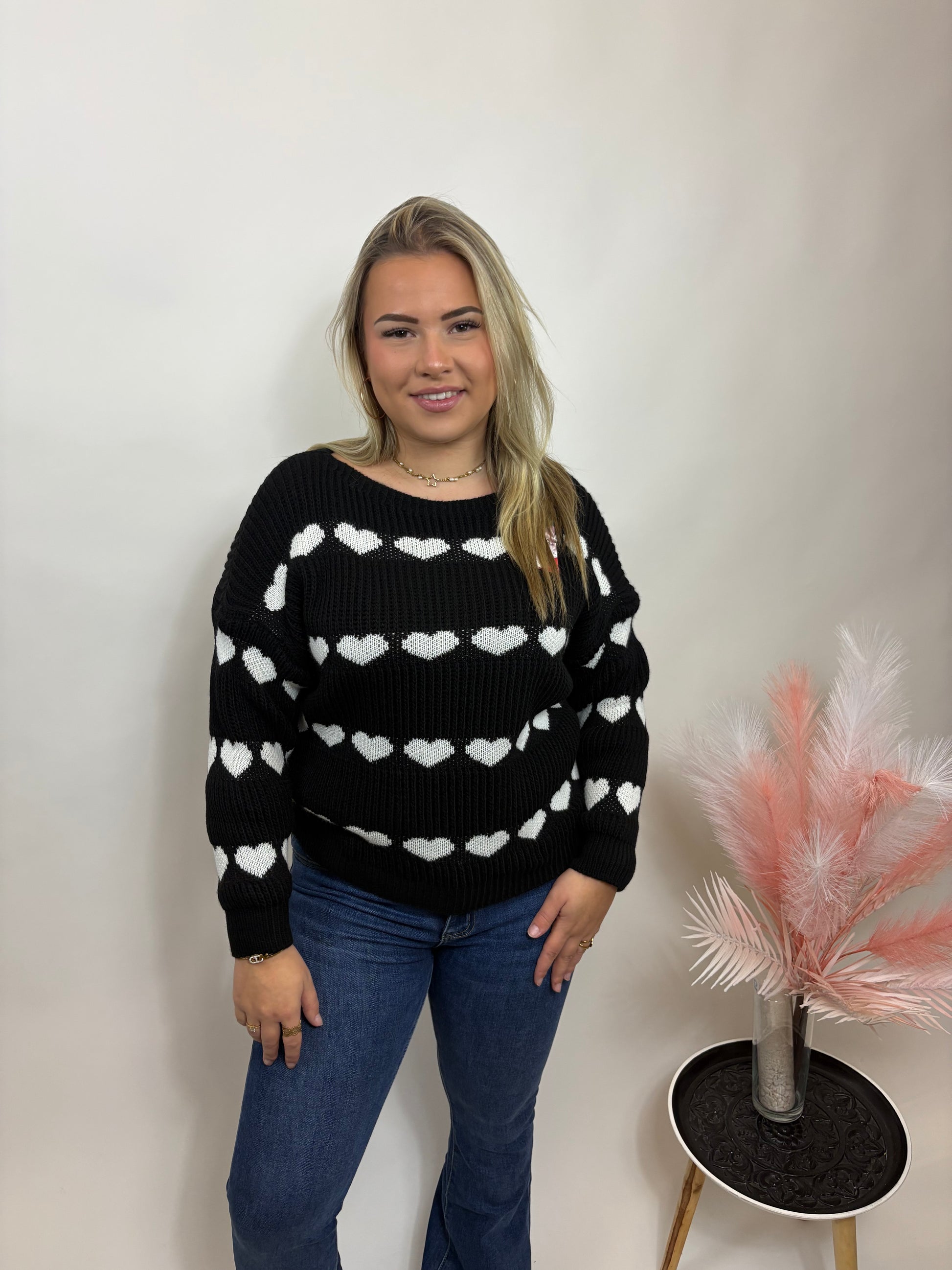 Deze knit brengt instant vrolijkheid in je outfit. De hartjes geven een speelse en lieve touch, terwijl de stof je warm en comfy houdt. Perfect voor een casual look met flair — of gewoon omdat je zin hebt in een beetje extra liefde in je outfit ✨